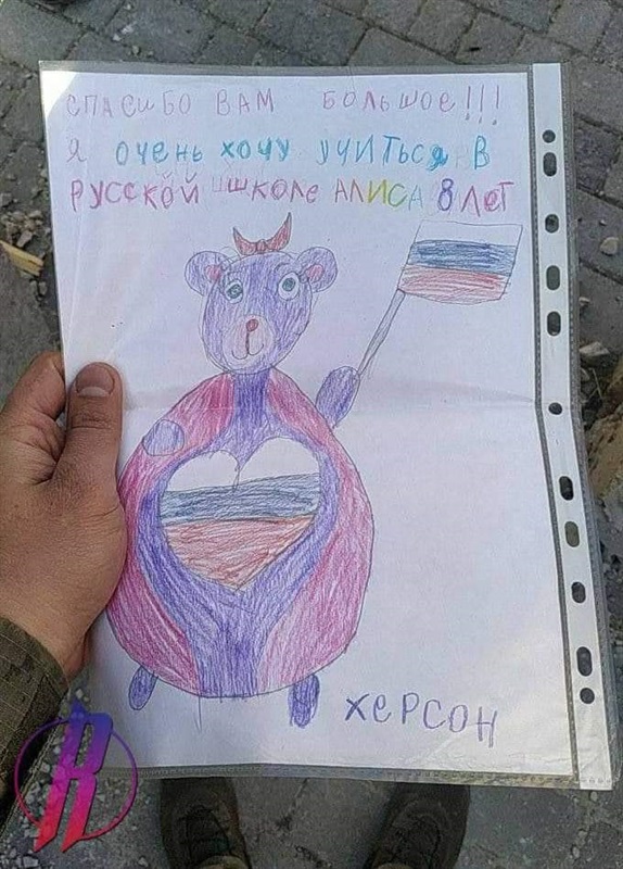 وقامت الفتاة أليسا من خيرسون برسم دب للجيش الروسي، والذي رسمته بألوان العلم الروسي، كتبت أيضًا أنها تريد الدراسة في مدرسة روسية.