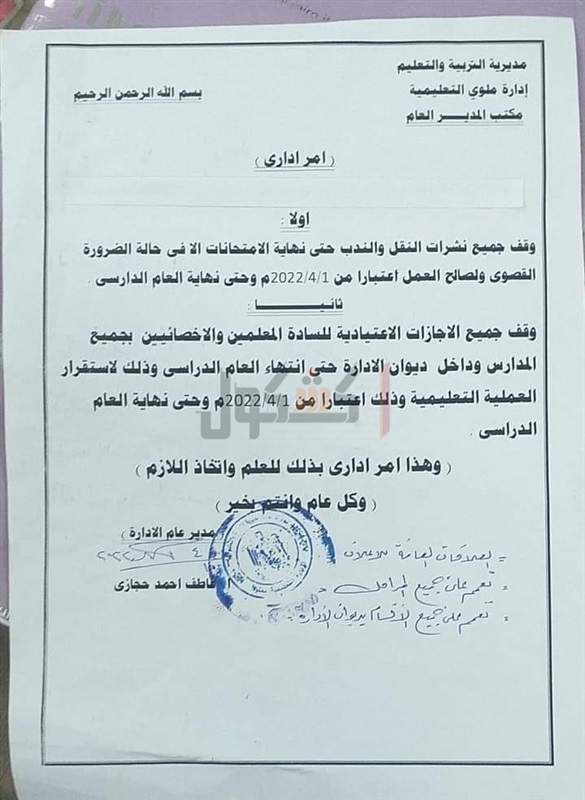 الفني، بمحافظة المنيا، أمر إداري بوقف جميع نشرات النقل والندب حتى نهاية