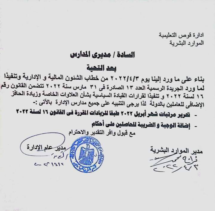 طالبت إدارة قوص التعليمية، بمحافظة المنيا، جميع المدارس التابعة لها، بتحيري مرتبات شهر أبريل 2022 طبقا للزيادات المقررة فى قانون 16 لسنة 2022، بالإضافة الى اضافة الوجبة والضريبة للحاصلين على أحكام.
