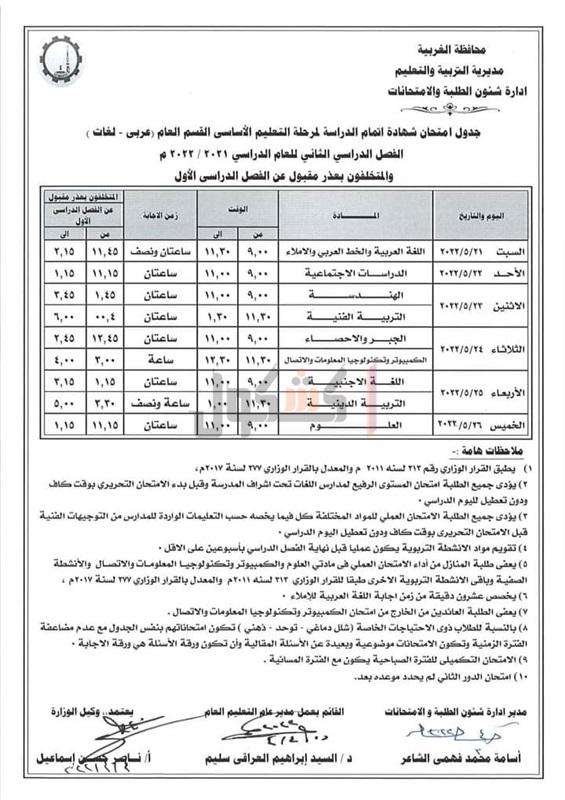 الغربية جدول امتحانات الشهادة الإعدادية لنهاية العام الدراسي 2021_2022، والتي