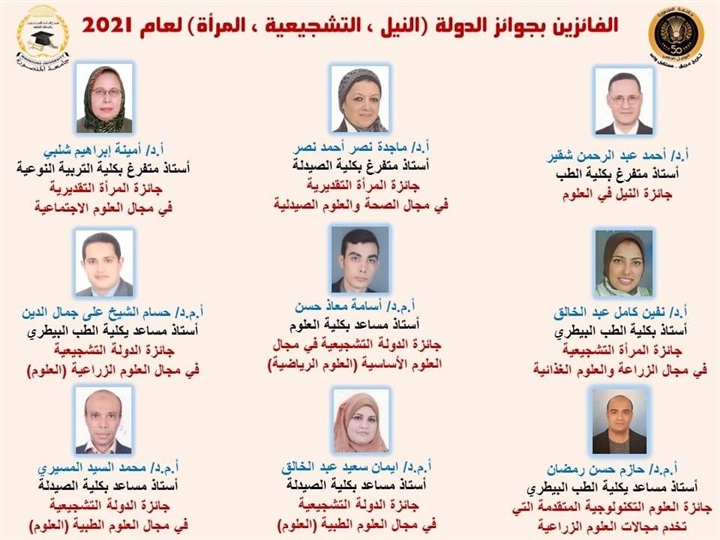- وفاز بجائزة الدولة التشجيعية فى العلوم والعلوم المتقدمة لعام 2021 م في مجال العلوم الأساسية جائزة العلوم الرياضية الدكتور أسامة معاذ علي حسن أستاذ مساعد بكلية العلوم - مجال العلوم الزراعية جائزة العلوم الدكتور حسام الشيخ علي جمال الدين أستاذ مساعد بكلية الطب البيطري - جائزة العلوم التكنولوجية المتقدمة التي تخدم العلوم الزراعية الدكتور حازم حسن السيد رمضان أستاذ مساعد كلية الطب البيطري - وفي مجال العلوم الطبية جائزة العلوم الدكتورة إيمان سعيد عبدالخالق أستاذ مساعد بكلية الصيدلة والدكتور محمد السيد المسيري أستاذ مساعد بكلية الصيدلة.