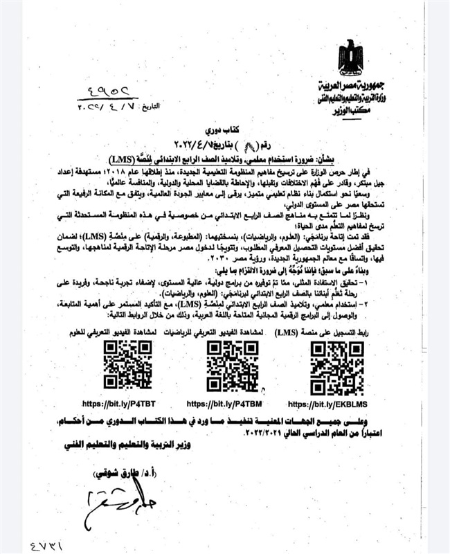 أصدرت وزارة التربية والتعليم والتعليم الفني خطابا، بشأن إتاحة برنامجي (العلوم، والرياضيات) بمناهج الصف الرابع الابتدائي.