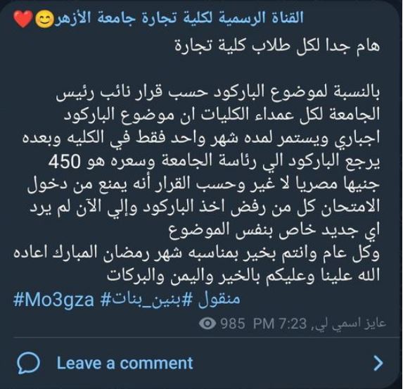 'القناة الرسمية لكلية تجارة جامعة الأزهر هام جدا لكل طلاب كلية تجارة بالنسبة لموضوع الباركود حسب قرار نائب رئيس الجامعة لكل عمداء الكليات ان موضوع الباركود اجباري ويستمر لمده شهر واحد فقط في الكليه وبعده يرجع الباركود الي رئاسة الجامعة وسعره هو 450 جنيها مصريا لا غير وحسب القرار أنه يمنع من دخول لامتحان كل من رفض اخذ الباركود وإلي الآن لم يرد اي جديد خاص بنفس ضوع وكل عام وانتم بخير شهر رمضان المبارك اعاده الله علينا وعليكم بالخير واليمن والبركات