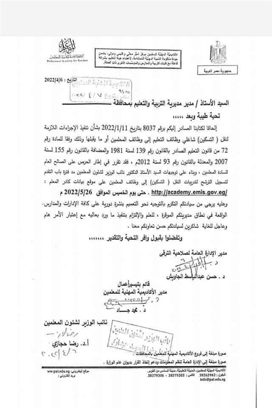 وقامت الوزارة بإرسال خطاب لمديريات التربية والتعليم، نص على انه إلحاقا لكتابنا الصادر إليكم برقم 8037 بتاريخ 1 2/1/1 202 بشان تنفيذ الإجراءات اللازمة لنقل ( التسكين) شاغلي وظائف التعليم إلى وظائف المعلمين أو ما يقبلها وذلك وفقا للمادة رقم 72 من قانون التعليم الصادر بالقانون رقم 139 لسنة 1981 والمضافة بالقانون رقم 155 لسنة 07 20 والمعدلة بالقانون رقم 93 لسنة 2012م ، قد تقرر في إطار الحرص على الصالح العام للمعلمين .