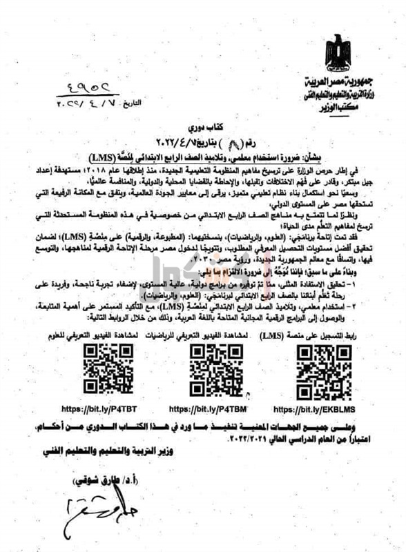 عممت وزارة التربية والتعليم والتعليم الفني، خطاب رسمي للمديريات التعليمية، بشأن ضرورة استخدام معلمي وتلاميذ الصف الرابع الابتدائي منصة lMS.