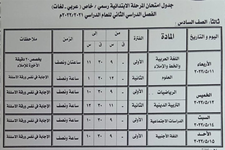 _ الصف السادس الابتدائى "من 11 إلى 15 مايو 2022 "