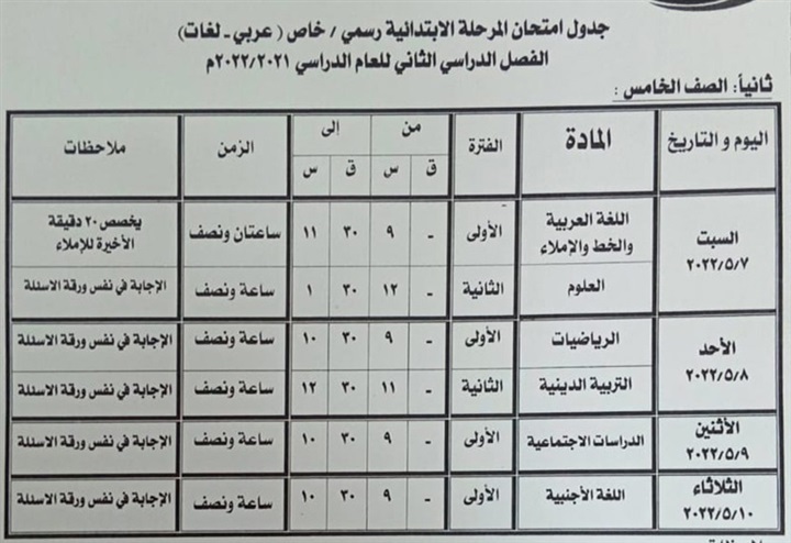 _ الصف الخامس الابتدائى "من 7 إلى 10 مايو 2022 "