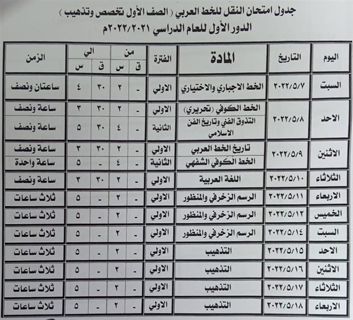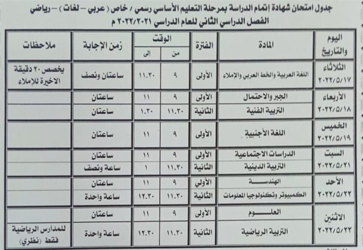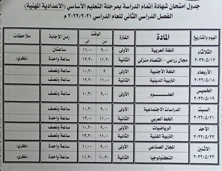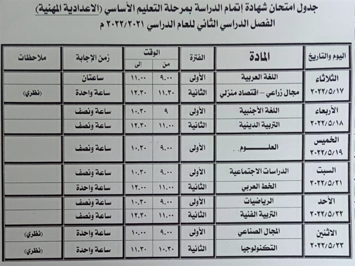 - الصفين الأول والثانى الإعدادى "من 7 إلى 11 مايو 2022"