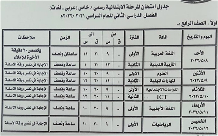 _ الصف الرابع الابتدائى "من 8 إلى 12 مايو 2022"