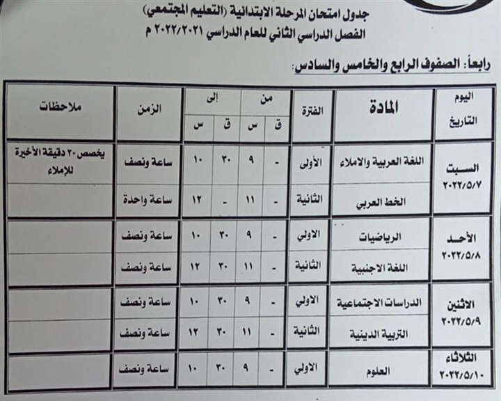-الصفوف الرابع والخامس والسادس " من 7 إلى 10 مايو 2022"