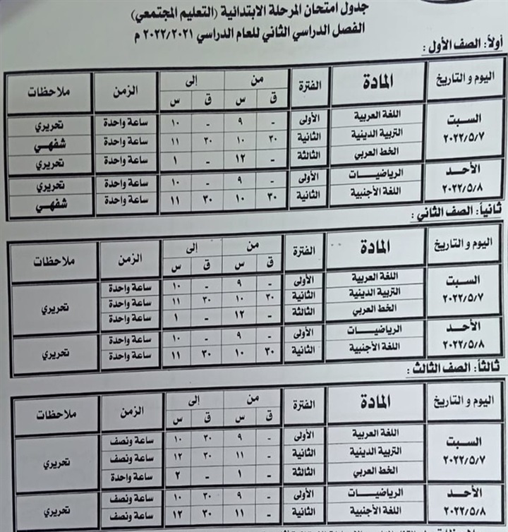 - الصفوف الأول والثانى والثالث يومي" 7 و 8 مايو 2022"