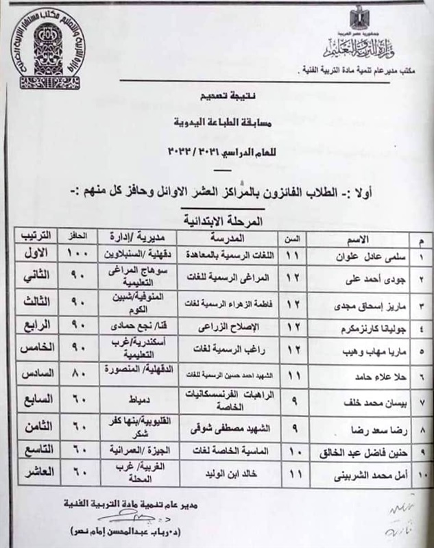 أعلن مكتب مدير عام تنمية مادة التربية الفنية بوزارة التربية والتعليم نتيجة مسابقة "الطباعة اليدوية" للعام الدراسي ٢٠٢١/ ٢٠٢٢ المرحلة الابتدائية.
