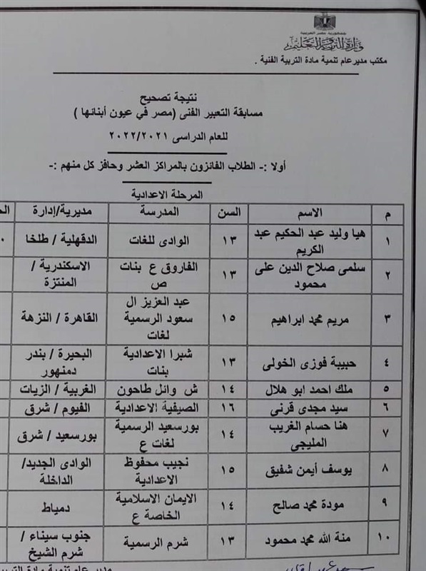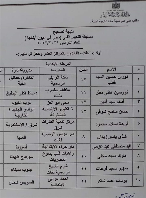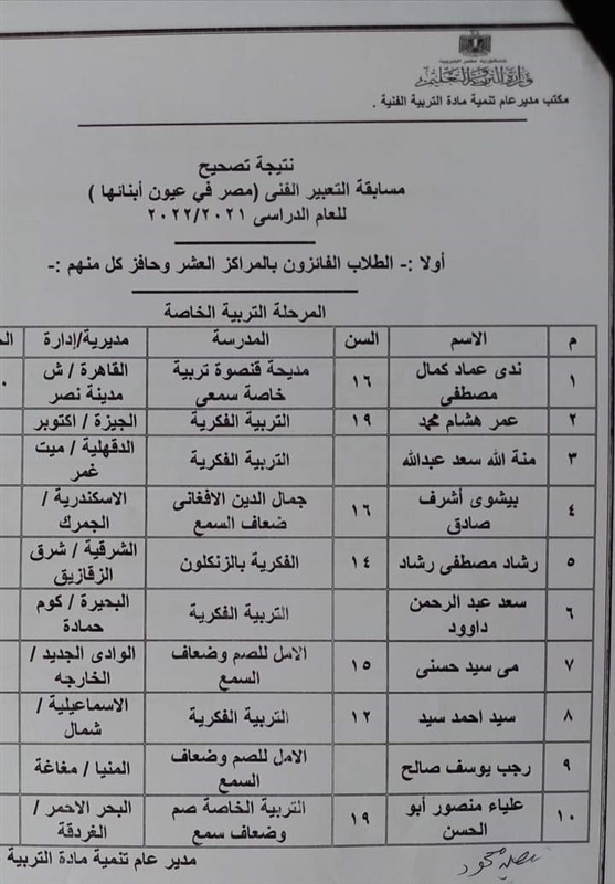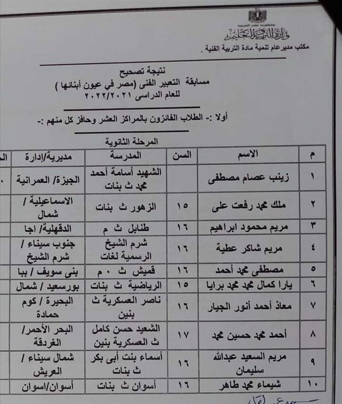 اعلنت وزارة التربية والتعليم والتعليم الفنى، اسماء الطلاب والطالبات الفائزين في المسابقة الفنية "مصر في عيون أبنائها" للعام الدراسى الجارى، حيث اكدت الوزارة ان مثل هذه المسابقات تمنح للطلاب فرص لعرض مواهبهم الرائعة وخلق شخصية تتسم بالتذوق للفن الراقى.