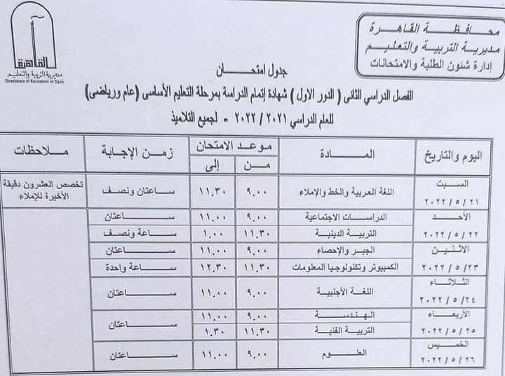 تعليم القاهرة تعلن جدول امتحانات نهاية العام للشهادة الإعدادية 2022