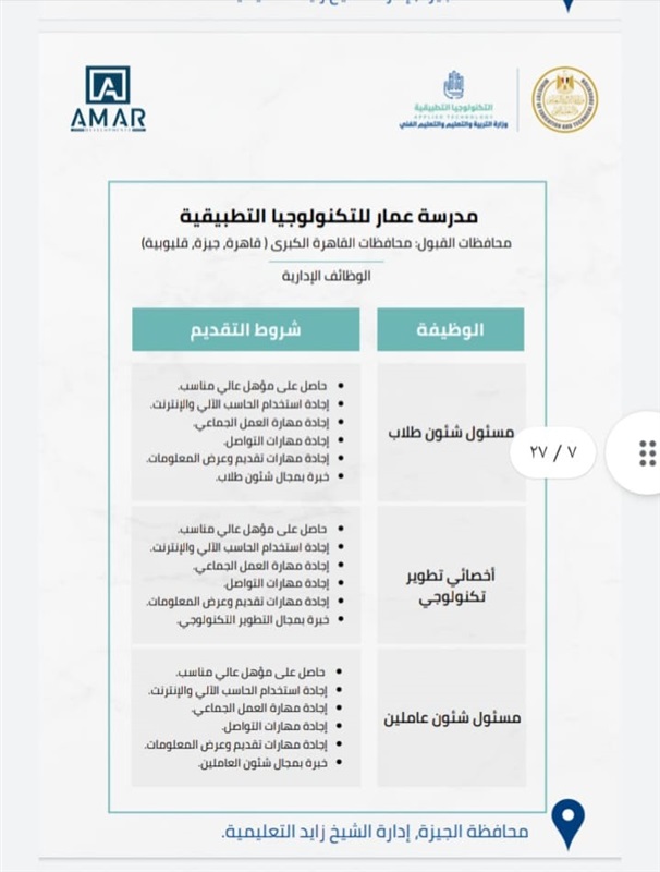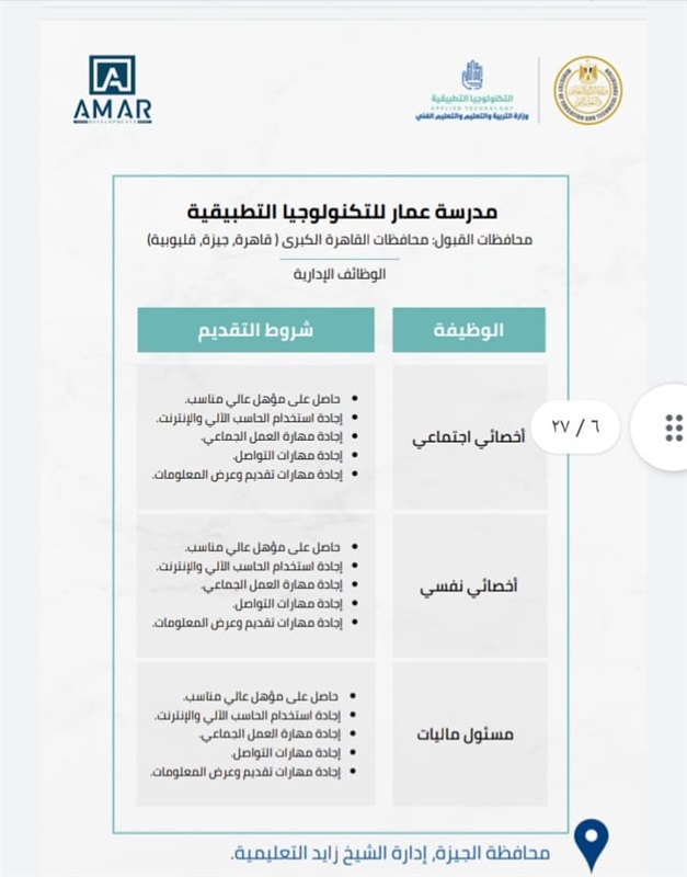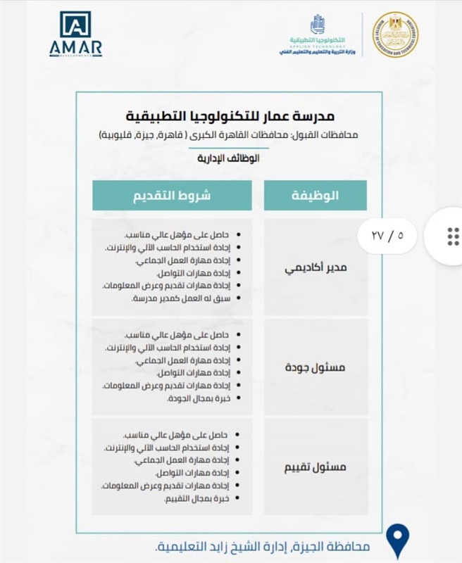 1- مدرسة عمار للتكنولوجيا التطبيقية ، وموقعها بمحافظة الجيزة _ إدارة الشيخ زايد.