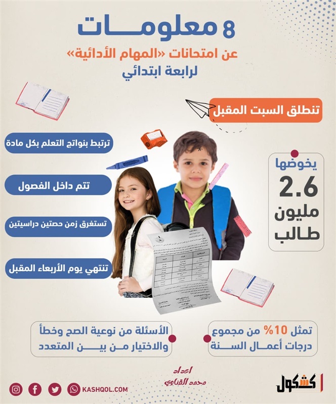 يرصد كشكول في الانفوجراف التالي 8 معلومات عن امتحانات «المهام الأدائية» لرابعة ابتدائي: