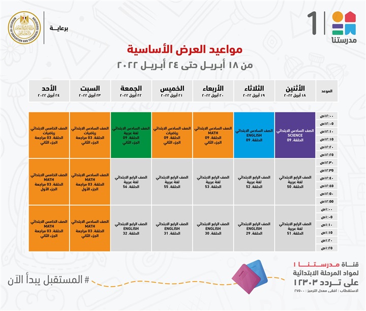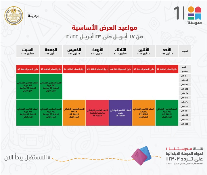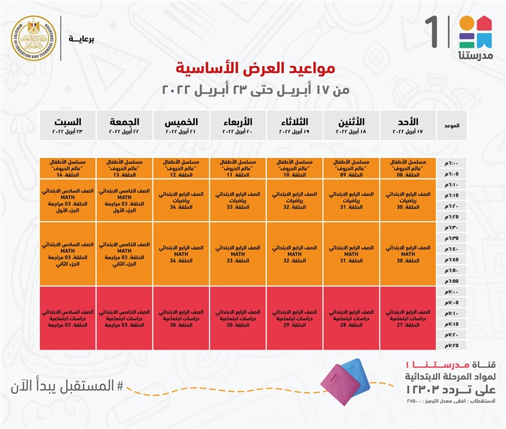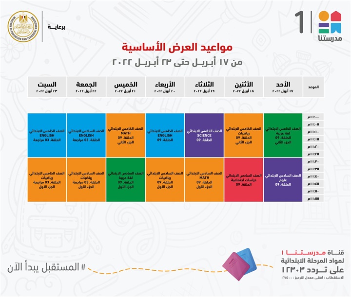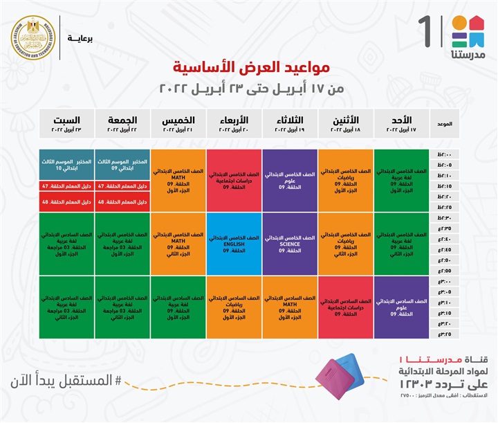 مواعيد عرض البرامج التعليمية للصفوف الابتدائية لهذا الأسبوع
