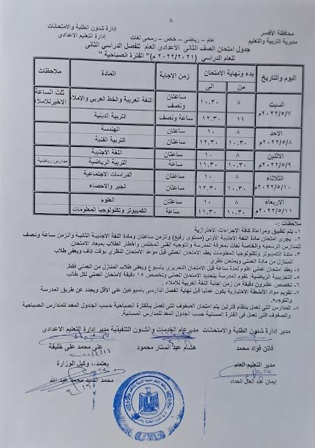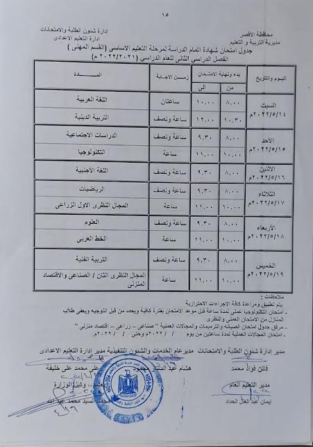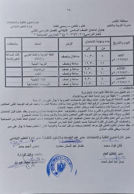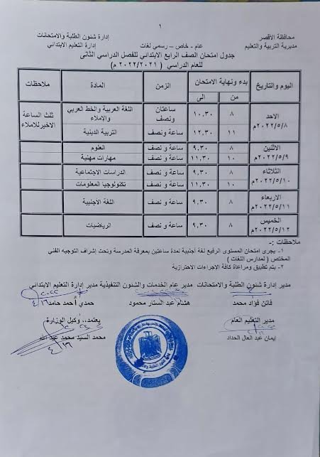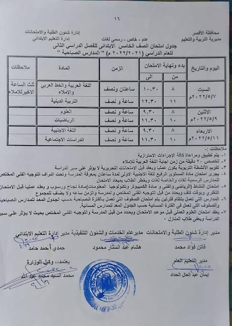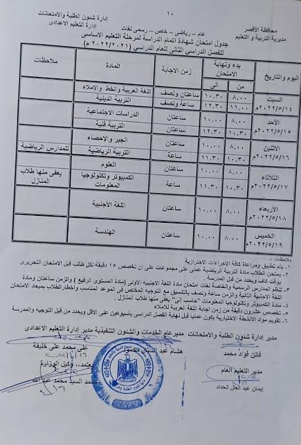 وقال محمد السيد عبد الله، وكيل وزارة التربية والتعليم بالأقصر، أنه و بناءًا على ما انتهت إليه الاجتماعات الدورية لمديري العموم ومديري الإدارات التعليمية ومديري إدارات التعليم المختلفة "عام - فني- تربية خاصة" بعد مراعاة الخريطة الزمنية للعام الدراسي 2022/2021 ومراعاة جميع الكتب الدورية والقرارات والتعليمات الواردة من وزارة التربية والتعليم والإمكانيات المتاحة لجميع المدارس تم اعتماد جدول امتحانات الفصل الدراسي الثاني.