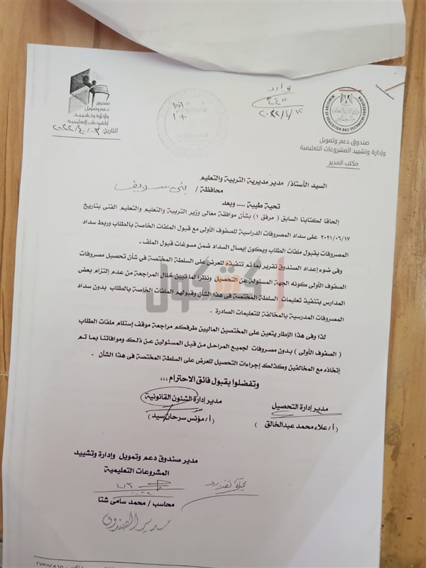 على المدارس التي تسلمت ملفات الصفوف الاولي دون سداد الرسوم، بسرعة السداد الفوري منعا من الإحالة للشئون القانونية.