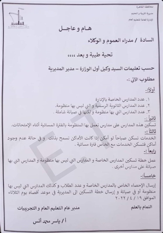 واخيرا، طالبت المديرية، ارسال الإحصاء الخاص بالمدارس الخاصة وعدد الطلاب وكذلك المدارس التي ليس بها المنظومة او في الصيانة وإرسال خطة التسكين الي في المديرية في موعد أقصاه الثلاثاء الموافق ١٩ ابريل الجاري.