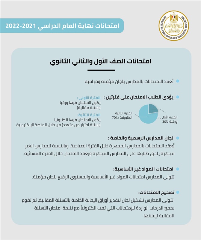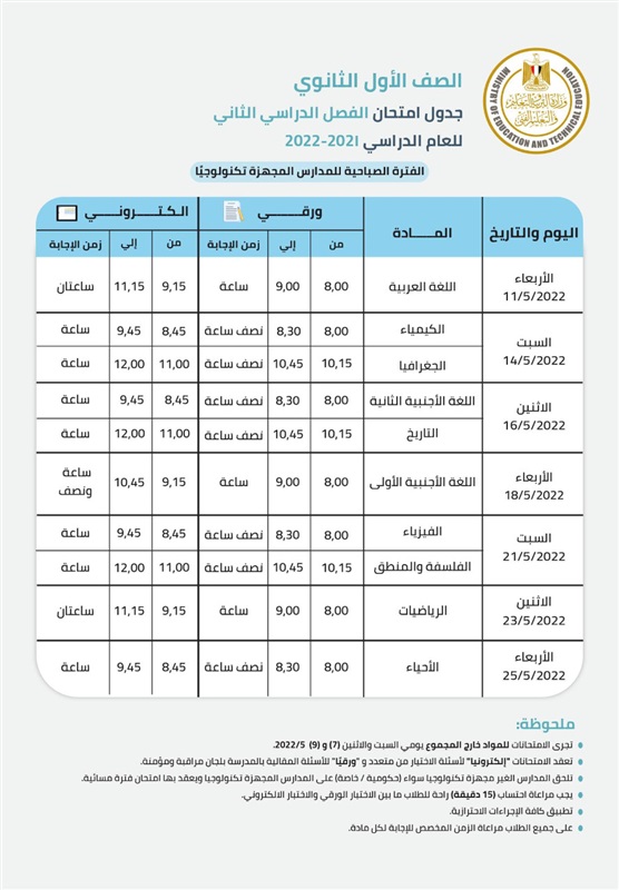 التربية والتعليم والتعليم الفني، جدول اختبارات نهاية العام الدراسي ٢٠٢١-٢٠٢٢ لطلاب