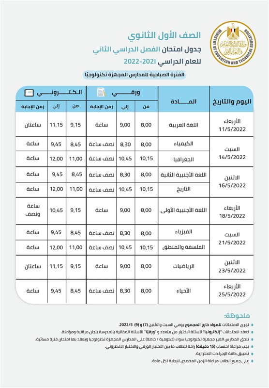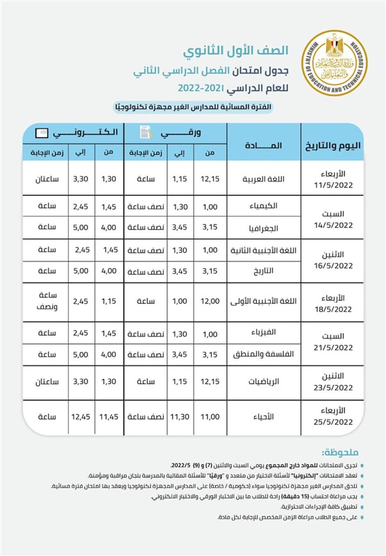 جدول امتحانات الصف الأول الثانوي 2022.. أعلن الدكتور طارق شوقي، وزير التربية والتعليم والتعليم الفني ، جدول اختبارات نهاية العام الدراسي ٢٠٢١ـ٢٠٢٢ لطلاب الصف الأول الثانوي، مع ملاحظة الآتي: