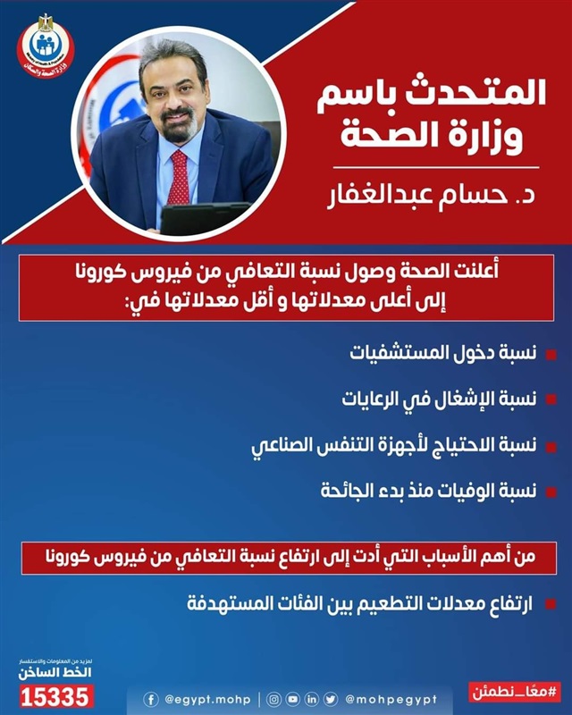 أعلن الدكتور حسام عبد الغفار المتحدث الرسمى لوزارة الصحة والسكان وصول نسبة التعافي من فيروس كورونا إلى أعلى معدلاتها وأقل معدلات في نسبة الوفيات، ودخول المستشفيات والرعاية المركزة، والاحتياج لأجهزة التنفس الصناعي.