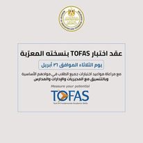 أعلنت وزارة التربية والتعليم والتعليم الفني عن عقد اختبار TOFAS بنسخته المعربة لجميع الصفوف يوم الثلاثاء الموافق ٢٦ أبريل ٢٠٢٢ مع مراعاة مواعيد اختبارات جميع الطلاب في موادهم الأساسية وبالتنسيق مع المديريات والإدارات والمدارس