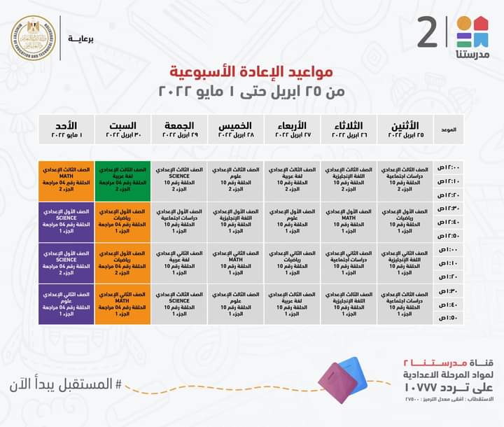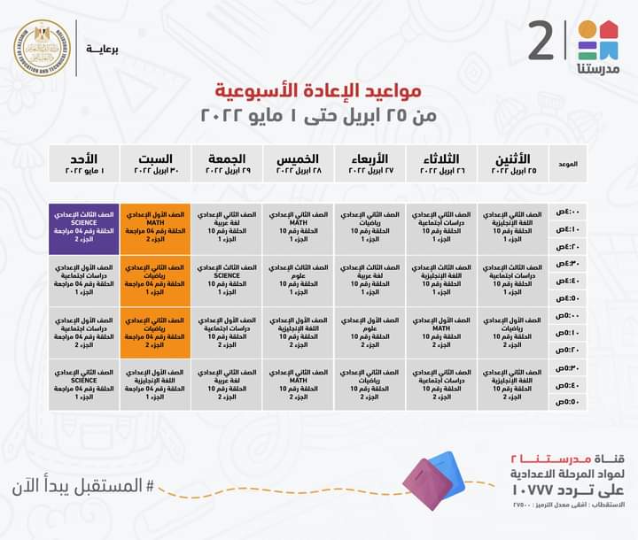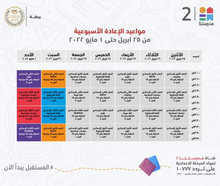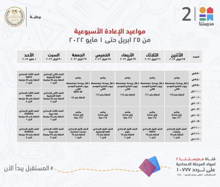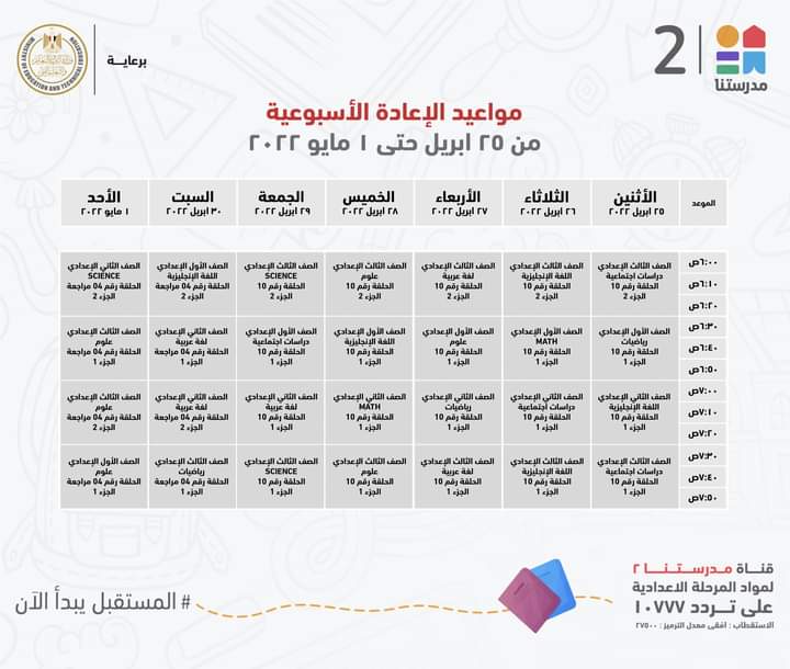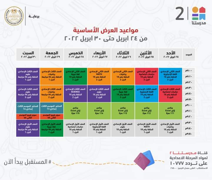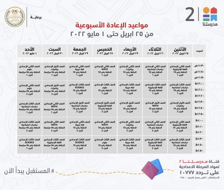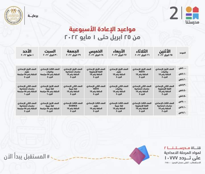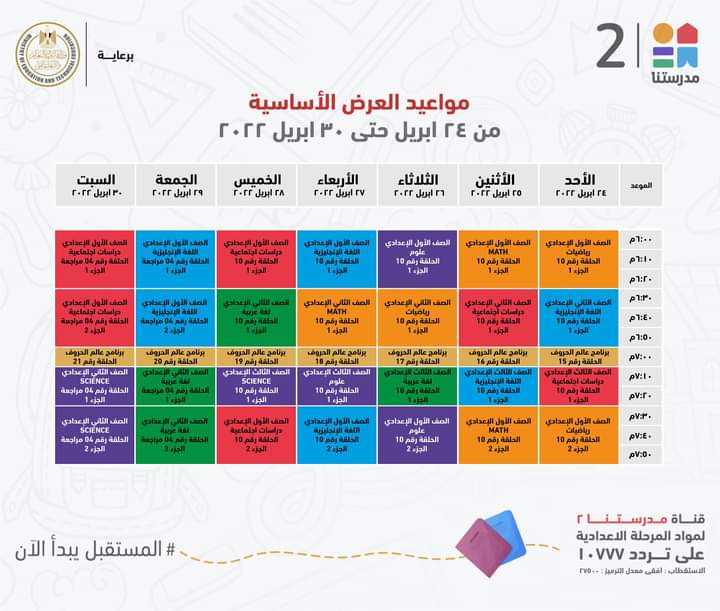 وأضافت قناة مدرستنا 2 التابعة لوزارة التربية والتعليم والتعليم الفني أنه يمكن للطلاب التعرف على مواعيد عرض البرامج التعليمية الخاصة بالصفوف الإعدادية للأسبوع العاشر للفصل الدراسي الثاني مع الإعادة، على التردد 10777 أفقي.