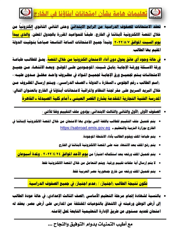وتابعت وزارة التربية تمام: يتم تحميل الملف ورفعه بعد استكماله اعتبارا من اليوم الأحد 24 أبريل ولمدة أسبوعين، ولا يتم إرسال أية ملفات تقييم ورقية ويتم التعامل من خلال المنصة الإلكترونية فقط، ويتم تحميل الملف ورفعه من خارج جمهورية مصر العربية فقط.