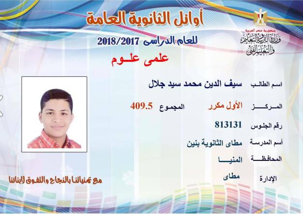"كنت علي ثقة بفضل الله أن أكون ضمن الأوائل علي مستوي الجمهورية حيث سبق أن حققت المركز الأول بالشهادتين الابتدائية والإعدادية علي مستوي المحافظة" هكذا بدأ سيف الدين محمد سيد الطالب بمدرسة مطاي الثانوية بنين شمال محافظة المنيا والحاصل علي المركز الأول مكرر بأوائل الثانوية العامة علي مستوي الجمهورية بمجموع 409.5 درجة بقسم علمي علوم كلامه مؤكدا أنه كان يحرص علي المذاكرة مبكرا وخاصة أيام العطلات.