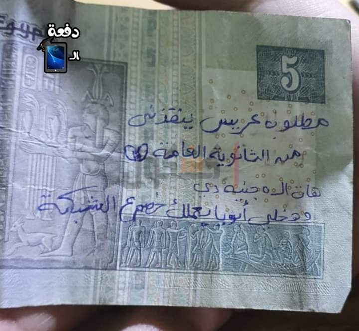 تداول رواد مواقع التواصل الاجتماعي، صورة لخمس جنيهات مكتوب عليها :«مطلوب عريس ينقذني من الثانوية العامة، وهات الخمسة جنيه دي هتخلي أبويا يعملك خصم على الشبكة».