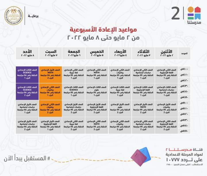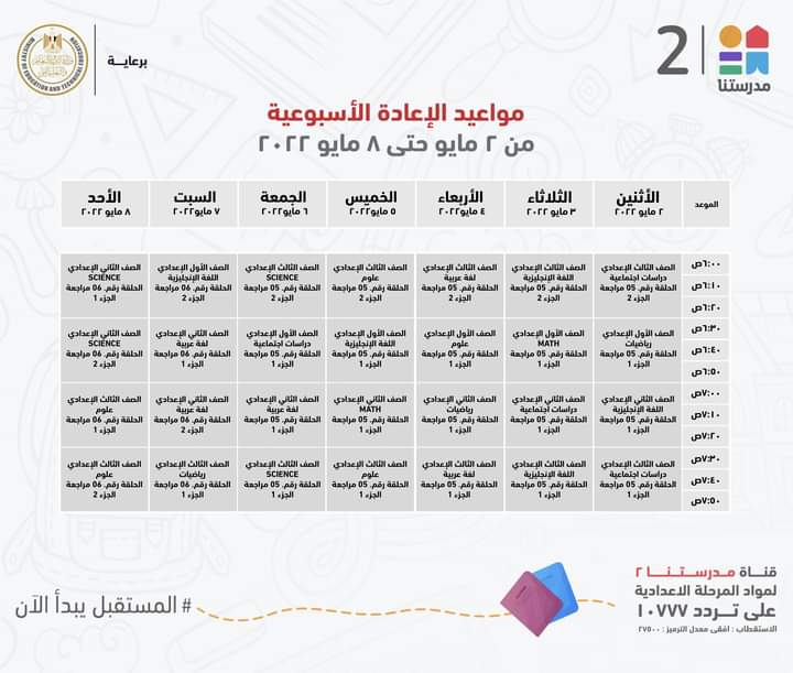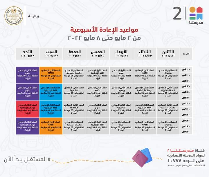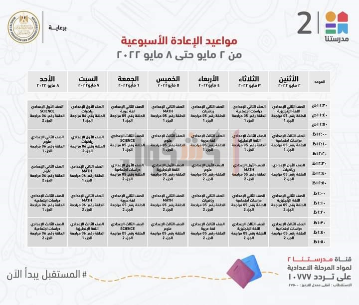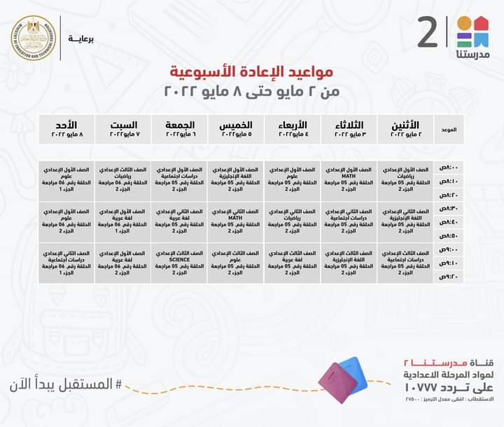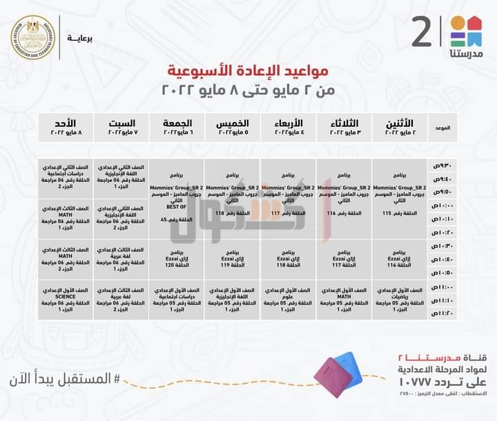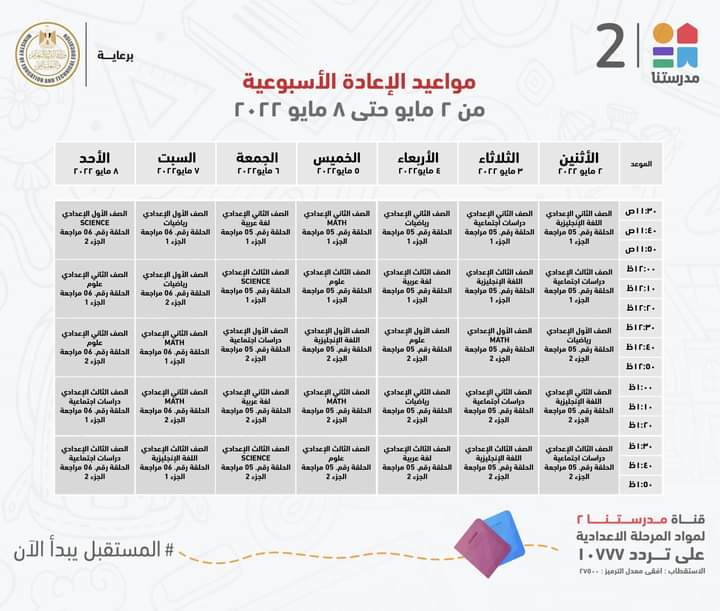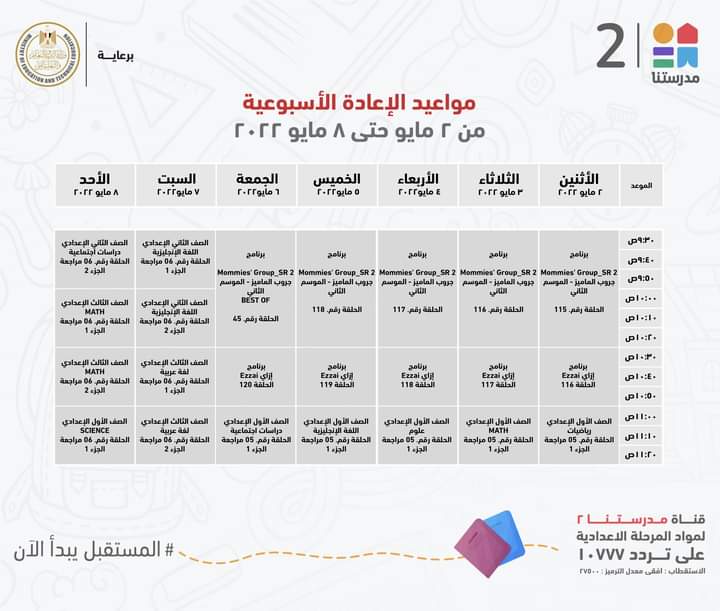 وقالت في منشور عبر صفحتها الرسمية بموقع التواصل الاجتماعي فيسبوك:( طلاب وأولياء أمور قناة "مدرستنا 2" الأعزاء، تعرّفوا على مواعيد عرض البرامج التعليمية الخاصة بالصفوف الإعدادية للأسبوع الحادي عشر للفصل الدراسي الثاني مع الإعادة).