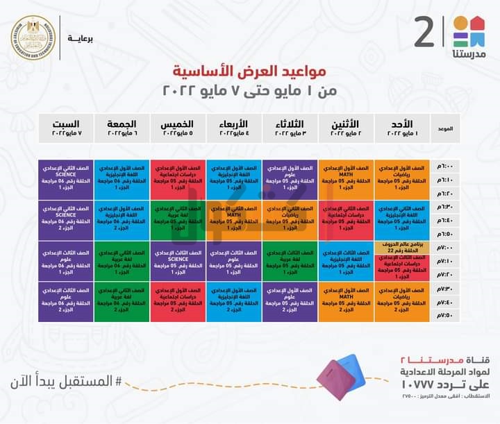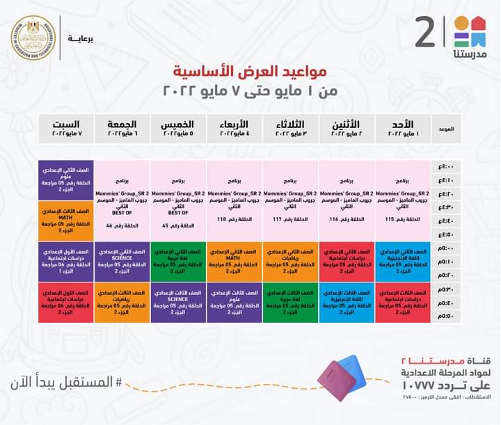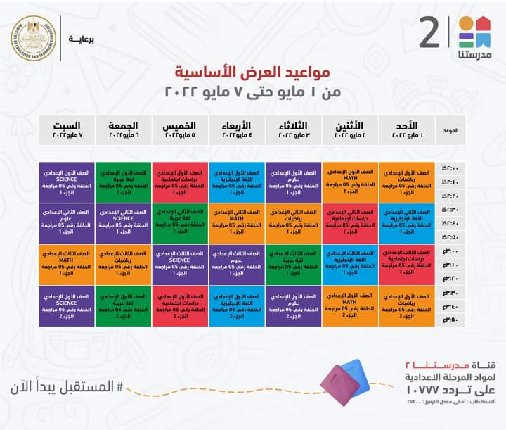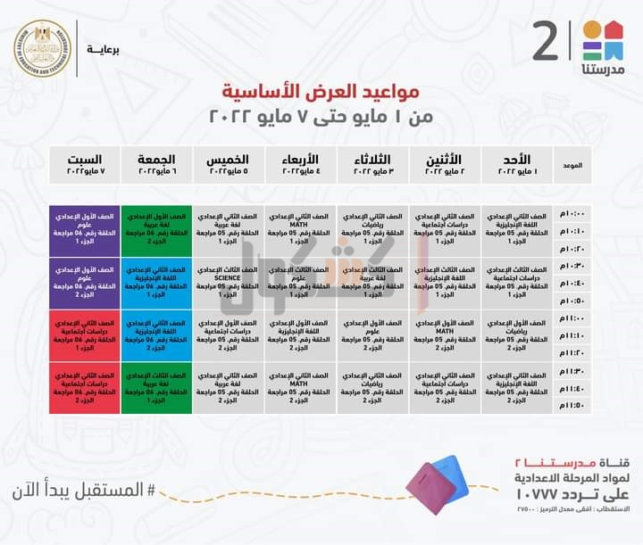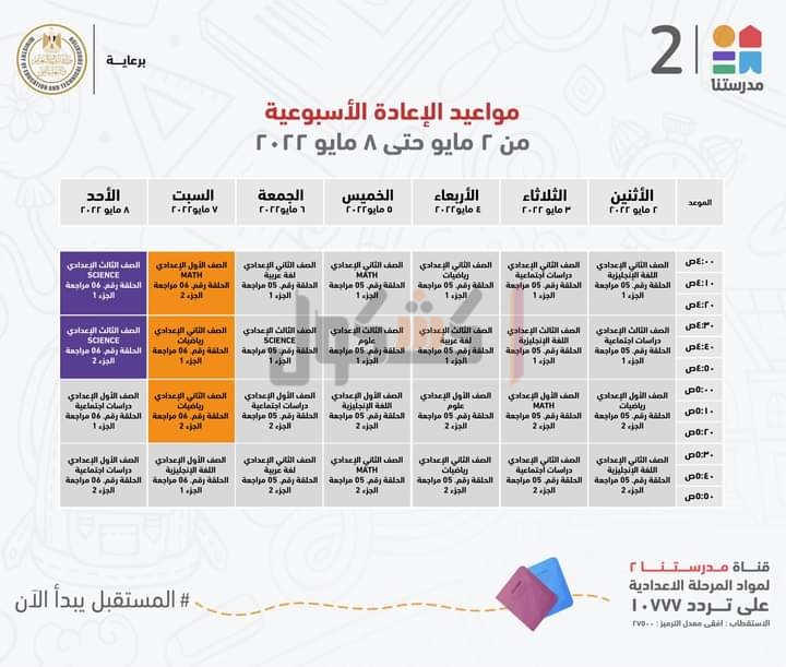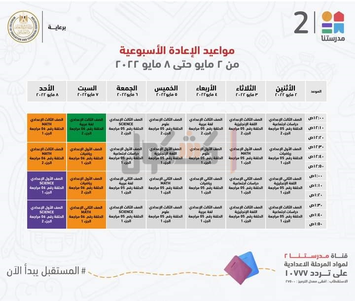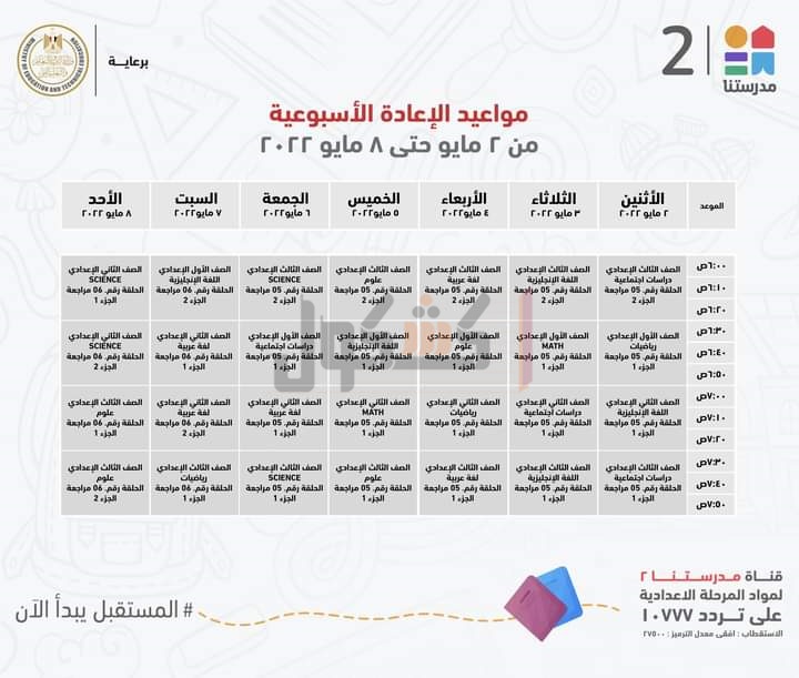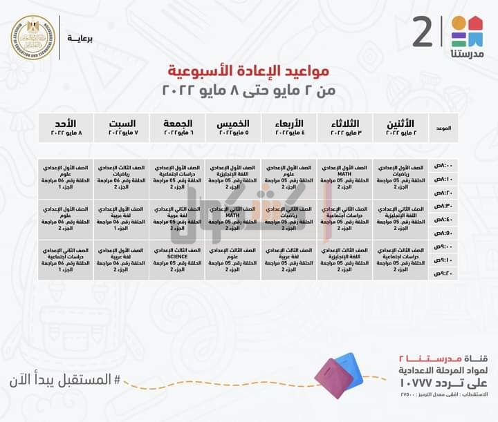 وقالت في منشور عبر صفحتها الرسمية بموقع التواصل الاجتماعي فيسبوك:( طلاب وأولياء أمور قناة "مدرستنا 2" الأعزاء، تعرّفوا على مواعيد عرض البرامج التعليمية الخاصة بالصفوف الإعدادية للأسبوع الحادي عشر للفصل الدراسي الثاني مع الإعادة).