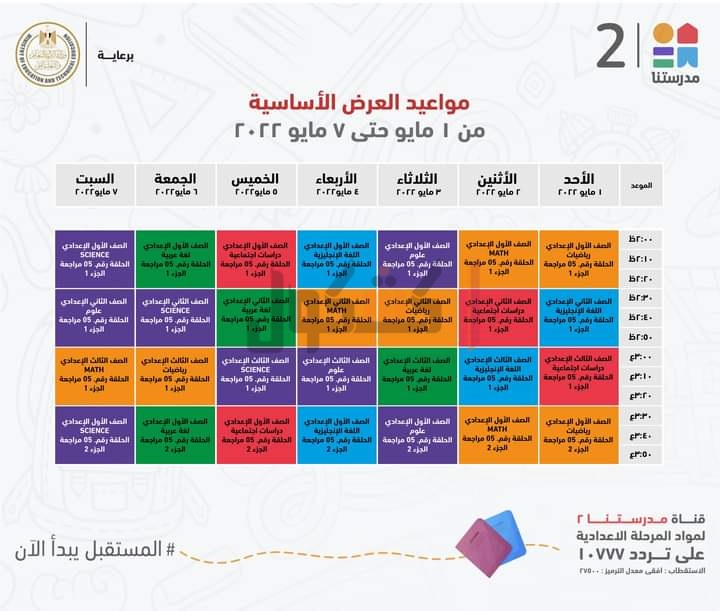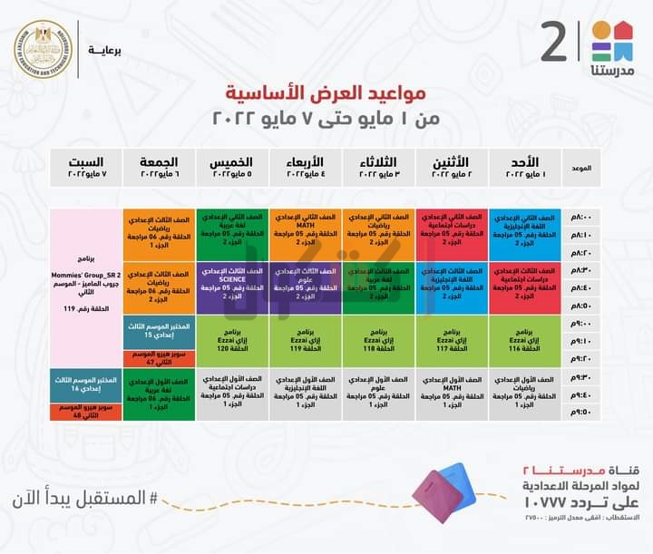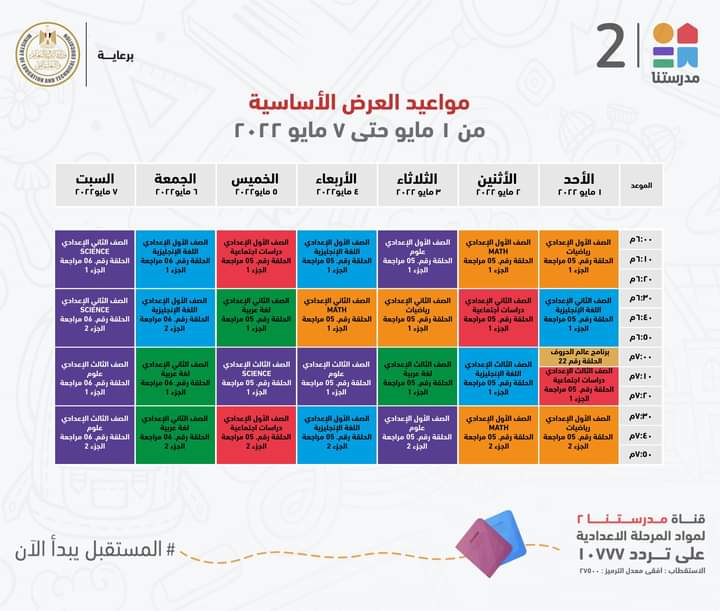 أعلنت القناة التعليمية مدرستنا التابعة لوزارة التربية والتعليم والتعليم الفني، مواعيد عرض المراجعات النهائية لصفوف الإعدادية.