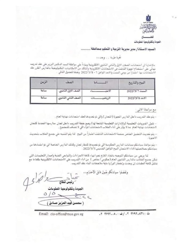 وجهت وزارة التربية والتعليم والتعليم الفني، خطابآ لجميع مديريات التعليم، بشأن موافقة وزير التربية والتعليم، على عقد تدريب نهائي للصفين الأول والثاني الثانوي، على استخدام اجهرة التابلت في الامتحانات الالكترونية .