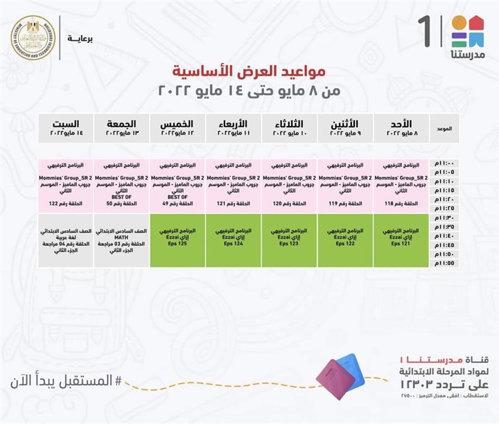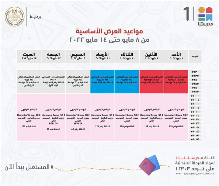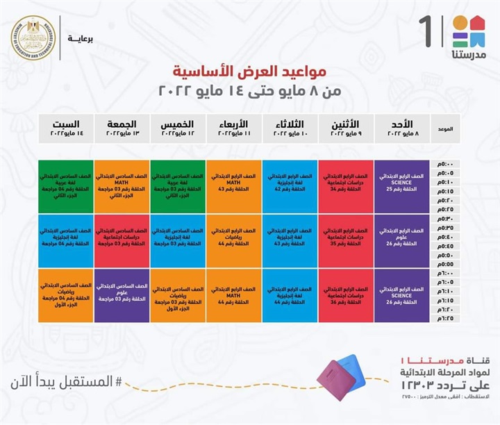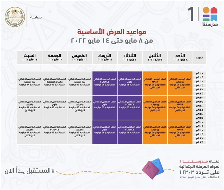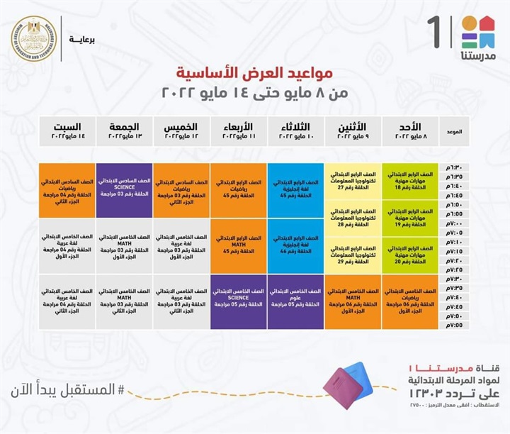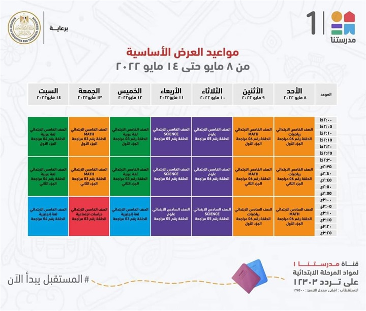 والتعليم والتعليم الفني الجدول الأسبوعي لمواعيد عرض المراجعات النهائية للمرحلة الابتدائية