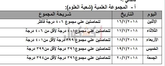وأعلنت الوزارة، الحد الأدنى للمرحلة الأولى، للشعبة العلمية 394 درجة فأكثر أي بنسبة 96.10% بمجموع عدد الطلاب