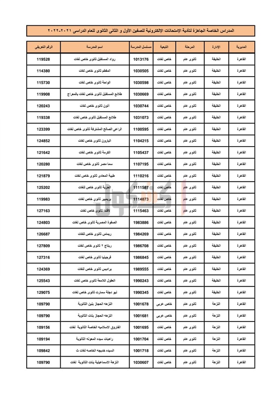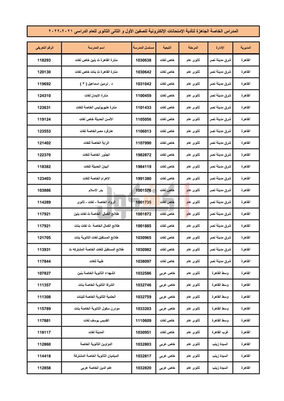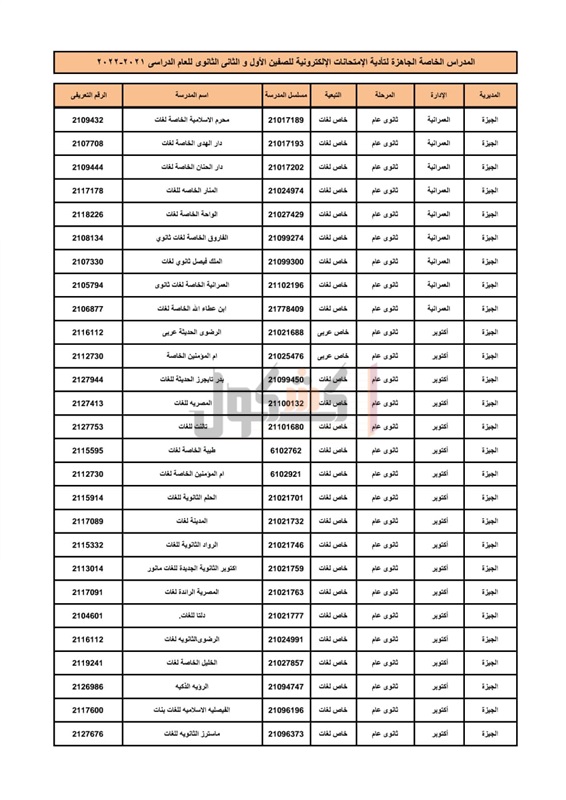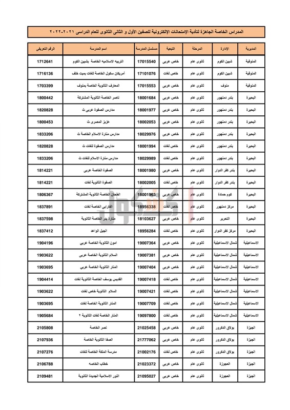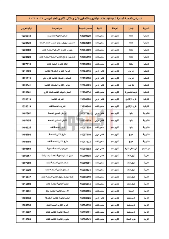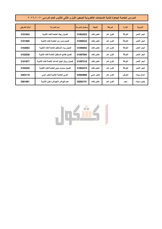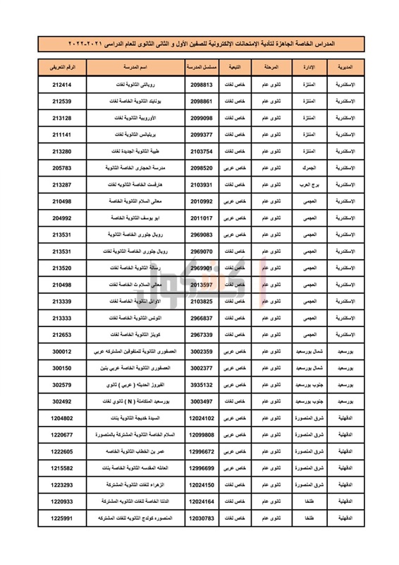 المعلنة، وفقًا للكشف، وذلك على مدار اليوم (لطلبة الصف الأول الثانوي) وغدًا الثلاثاء