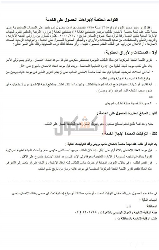 _ قبل موعد انعقاد الامتحان بثلاثة أيام على الاقل، اذا كان الطالب موجودا بمستشفى حكومي وأعدت اللجنة الطبية المركزية تقرير بحالته وتم تسليمه للمديرية أو الإدارة التعليمية بمعرفة ولي الامر قبل موعد انعقاد الامتحان بأسبوع