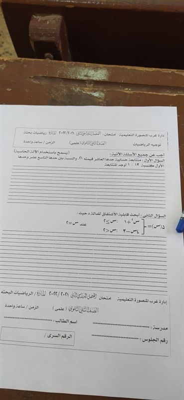 الثاني الثانوي، اليوم الخميس، الامتحان في مادة الجبر والتفاضل وحساب المثلثات، ضمن