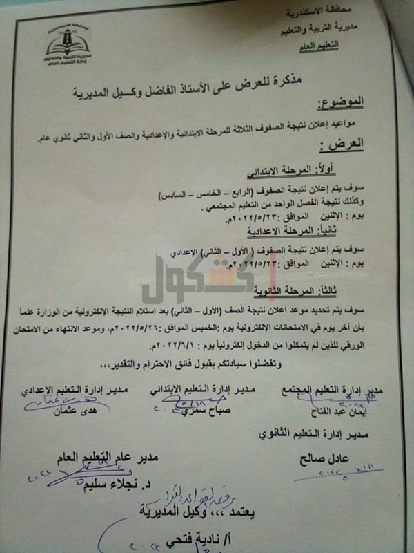 وافقت نادية فتحي وكيل مديرية التربية والتعليم والتعليم الفنى بالإسكندرية على مواعيد إعلان نتيجة الصفوف الثلاثة للمرحلة الابتدائية والإعدادية والصف الأول والثاني الثانوي.