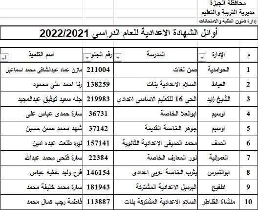 بالأسماء والمجموع.. أوائل الشهادة الإعدادية 2022 بالجيزة