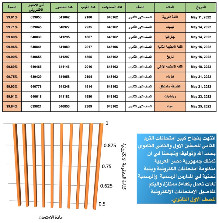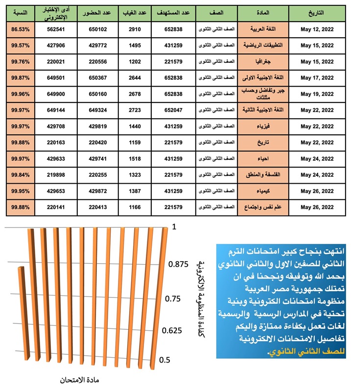 ونجحت الوزارة بشكل كبير فى تنظيم امتحانات الفصل الدراسى الثانى من العام الدراسى 2021/2022 إلكترونيا، وأصبحت جمهورية مصر العربية تمتلك منظومة امتحانات إلكترونية وبنية تحتية فى المدارس الرسمية والرسمية لغات تعمل بكفاءة ممتازة.