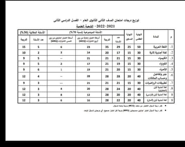 «التعليم» تعلن توزيع درجات الصفين الأول والثاني الثانوى الترم الثاني 2022