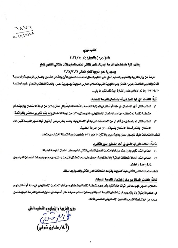 والتعليم والتعليم الفني، خطابًا لمديريات التربية والتعليم بشأن تنظيم أعمال امتحانات