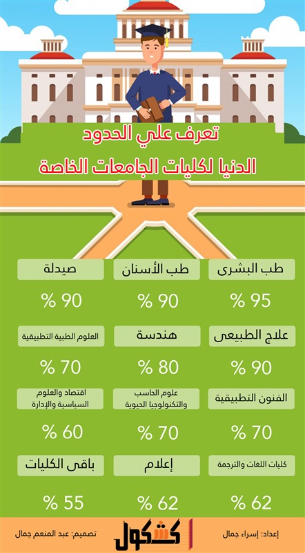 جراف انفوجراف: تعرف على الحدود الدنيا لكليات الجامعات الخاصة الإثنين 16/يوليو/2018 - 01:27 م 7/16/2018 1:27:00 PM طباعة facebook twitter whats شارك