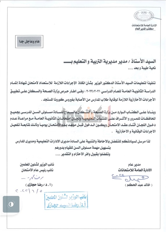 خطاب عاجل بشأن لجان امتحانات الثانوية العامة 2022 "مستند"