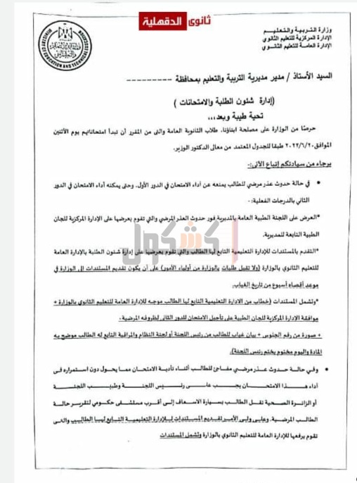 لفتت إلى أنه في حالة حدوث عذر مرضي يمنع الطالب من أداء امتحان الدور الأول للعام الدراسي 2021/2022، وحتى يمكنه أداء الامتحان في الدور الثاني بالدرجة الفعلية، يتم اتباع الآتي: