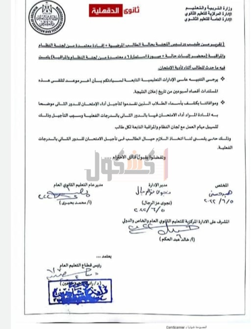 كما وجهت بموافاتها بكشف بأسماء الطلاب الطلاب الذين تقدموا لتأجيل أداء الامتحان للدور الثاني، موضحاً به المادة المراد أداء الامتحان فيها بالدور الثاني بالدرجات الفعلية، وسبب التأجيل، وذلك لتسهيل مهام العمل مع لجان النظام والمراقبة التابعة لها كل طالب، وحتى يتسنى اتخاذ اللازم حيال الطالب لتأجيل امتحانه للدور الثاني بالدرجة الفعلية.